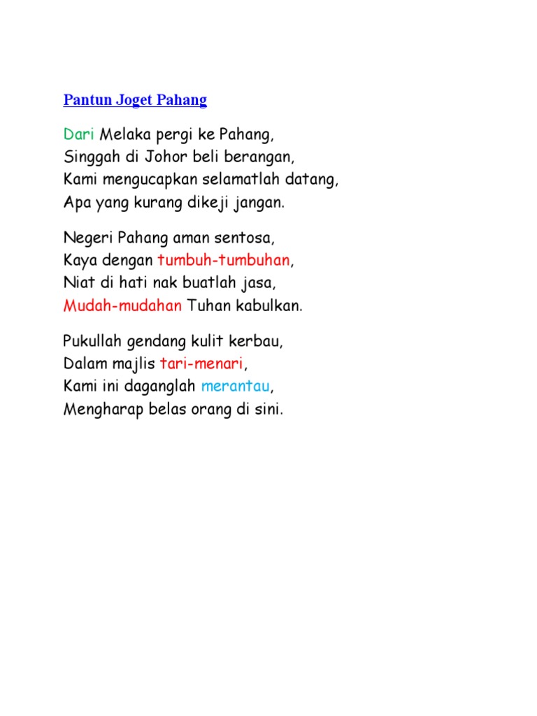 Pantun Lagu Joget Pahang Dari Melaka pergi ke Pahang Singgah di Johor beli barangan Kami mengucap Selamat Datang Apa yang kurang dikeji jangan Negeri Pahang aman sentosa Kaya dengan tumbuh-tumbuhan Niat di hati nak buat jasa Mudah-mudahan Tuhan makbulkan Pukul gendang kulit kerbau Dalam majlis tari-menari Kami ini dagang merantau. Nanti orang pun sayang. Singgah di Johor beli berangan.